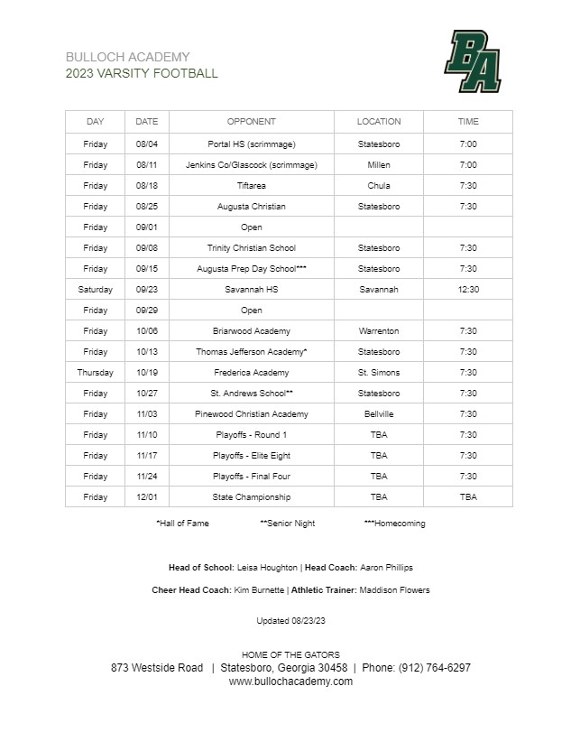 The Bulloch Academy family loves football and enjoys spending our Friday evenings cheering on our Varsity Gators! We also have elementary and middle school football teams to allow for our young Gators to learn the sport in a safe and fun environment.