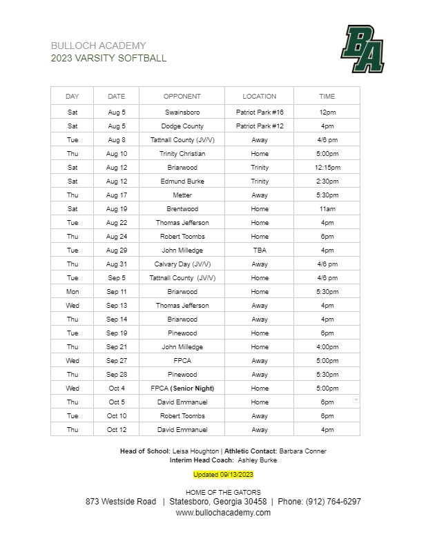 2025 Bulloch Academy Softball Schedules