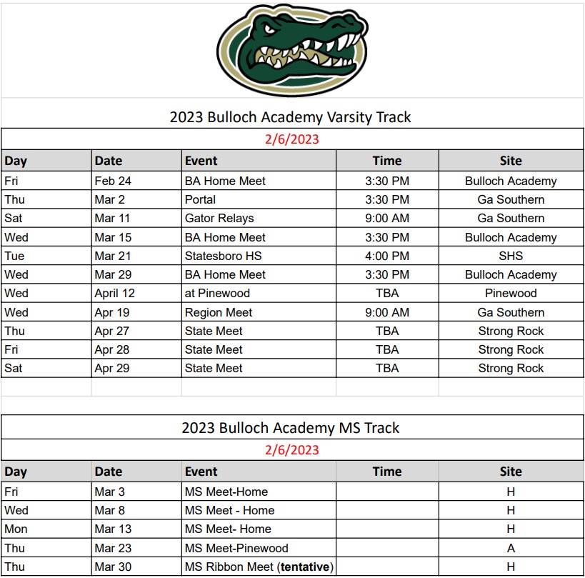 2025 Bulloch Academy Track & Field Schedules